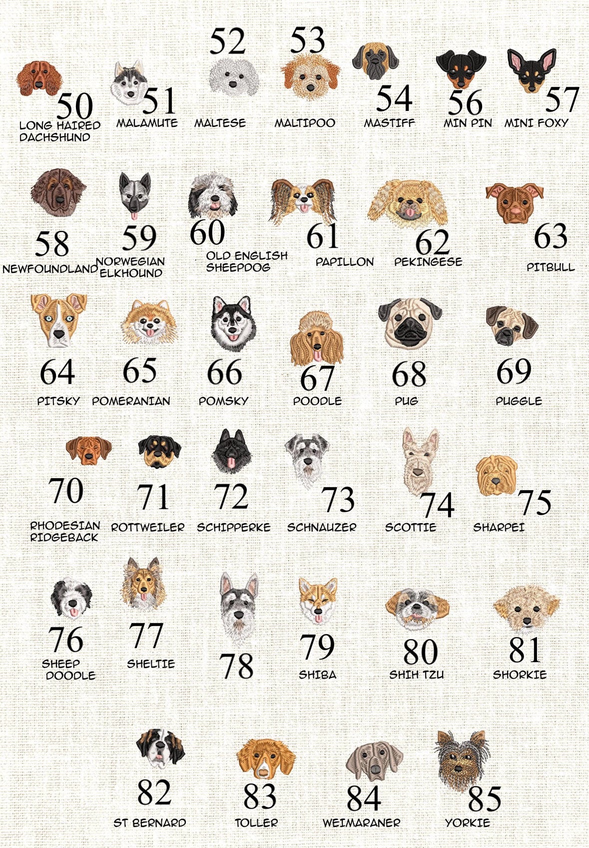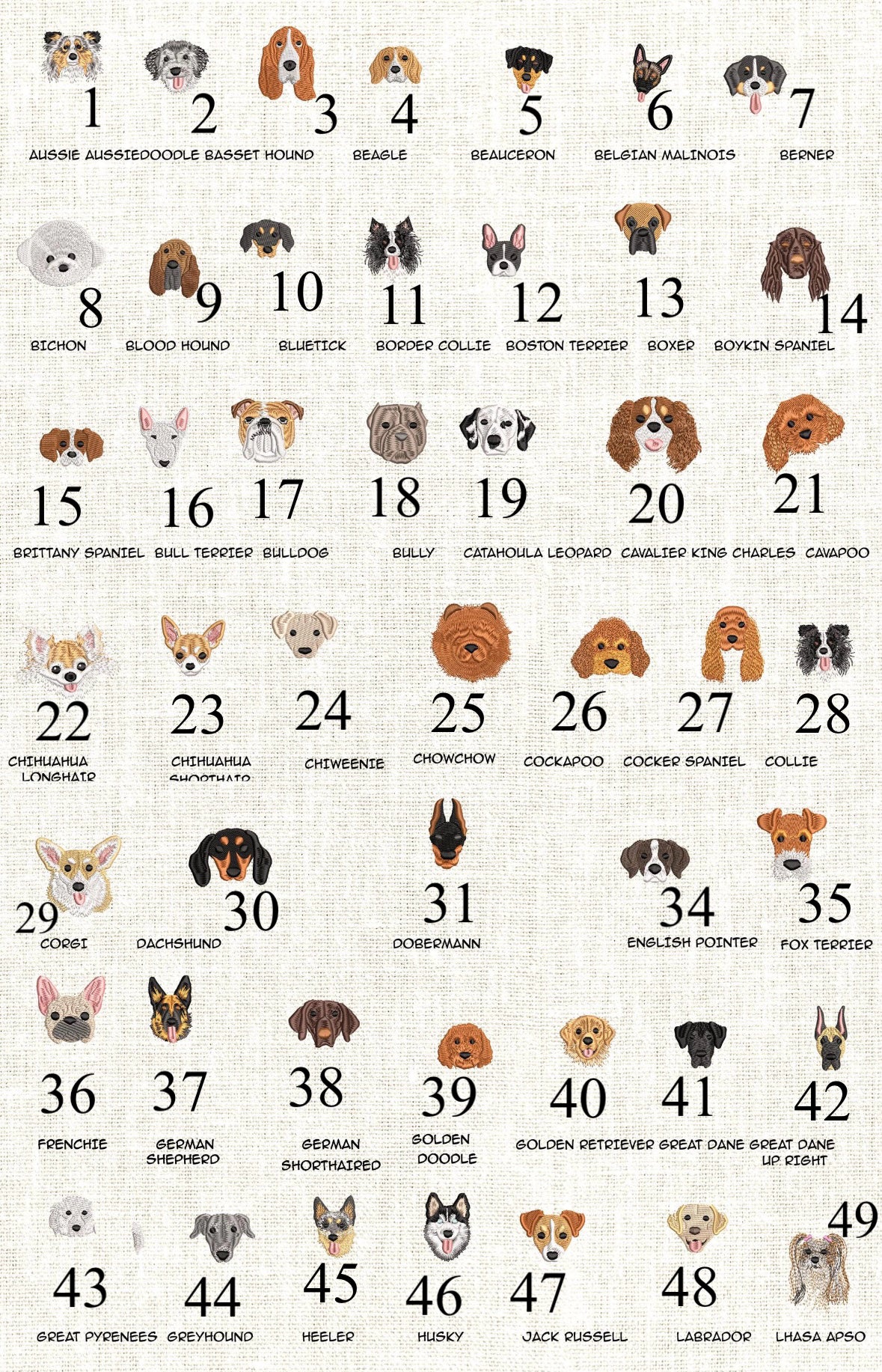 ❥ Bitte lade ein Foto deines Hundes hoch, damit ich die Farben entsprechend anpassen kann. Bitte beachte, dass ich nicht jede Einzelheit, wie z.B. Muster, Punkte, … beachten und anpassen kann. Es werden nur die Grundfarben angepasst. Wenn du kein Foto hochlädst, wird er so wie auf dem Beispielfoto oben gestickt.